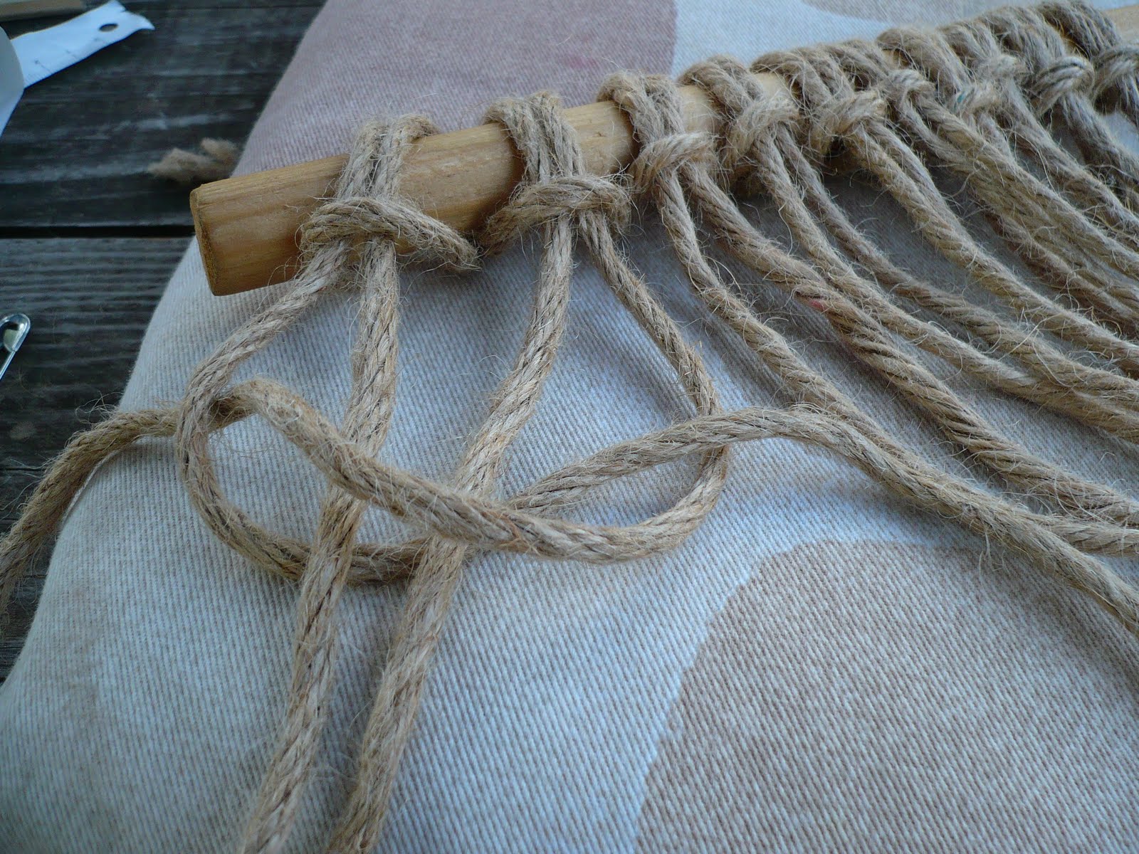 Pentru inceput, iti masori 6 fire de 2 metri si 4 fire de 1,40 metri. Iti fixezi mai intai firele de 2 m pe bat, iar apoi 2 fire de 1,40 la un capat si 2 la celalalt capat.Incepi lucrul cu urmatorul nod:Si urmezi urmatoarele etape: